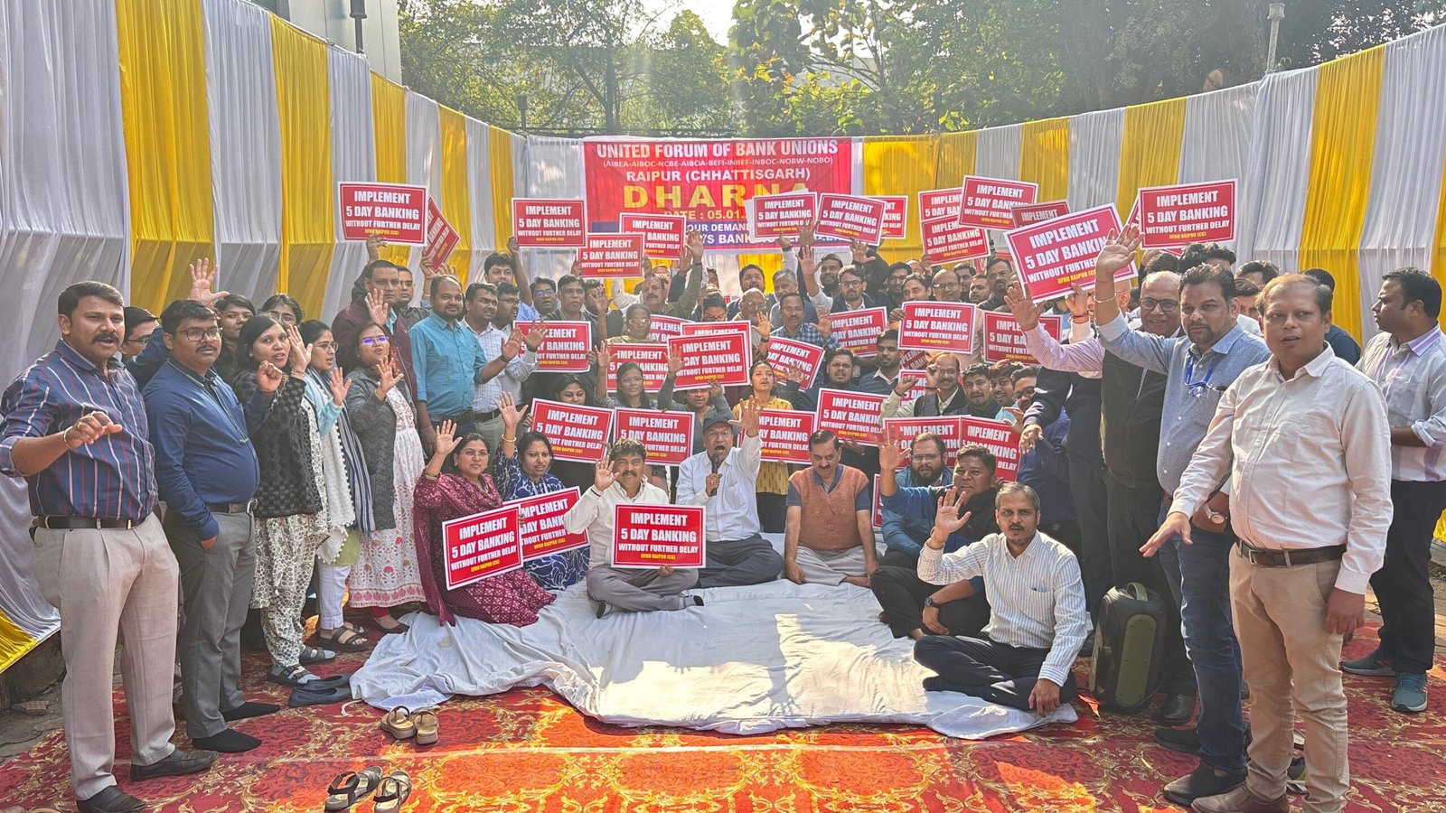 पांच दिवसीय कार्य सप्ताह की मांग को लेकर रायपुर में बैंकरों का धरना