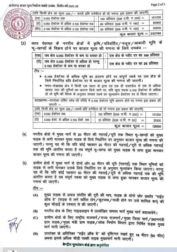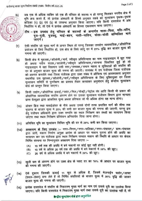 रायपुर : छत्तीसगढ़ सरकार ने जमीन की नई गाइडलाइन दर जारी की है। 20 नवंबर से राज्य में लागू नई गाइडलाइन दरों के संबंध में विभिन्न हितधारकों से सुझाव, ज्ञापन एवं प्रस्ताव प्राप्त हुए थे। इन पर विचार करने के लिए मुख्यमंत्री विष्णुदेव साय एवं वित्त मंत्री ओपी चौधरी के निर्देश पर केन्द्रीय मूल्यांकन बोर्ड की बैठक हुई, जिसमें कई महत्वपूर्ण निर्णय लिए गए। गाइडलाइन में बड़े बदलाव किए गए हैं। सेंट्रल वैल्यूएशन बोर्ड की मीटिंग के बाद इंस्पेक्टर जनरल ऑफ रजिस्ट्रेशन और सुपरिटेंडेंट ऑफ स्टैंप्स छत्तीसगढ़ ने नई रिवाइज्ड गाइडलाइन जारी की है। वहीं डिस्ट्रिक्ट वैल्यूएशन कमेटियों को 31 दिसंबर 2025 तक नए प्रपोजल सबमिट करने के निर्देश भी दिए गए हैं।